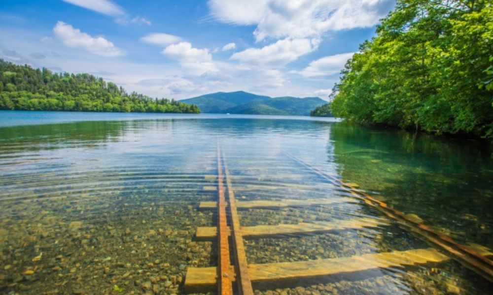 湖の水位が下がる春から秋にかけて、線路が湖底から姿を現します。